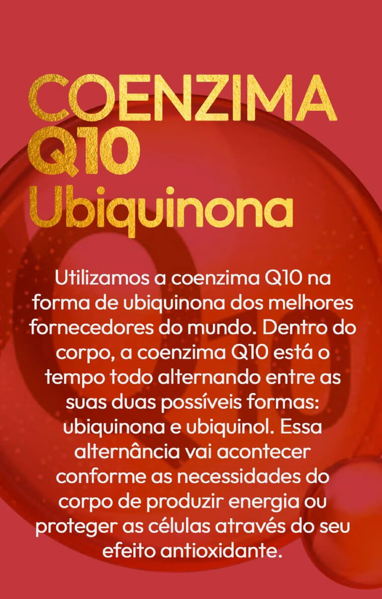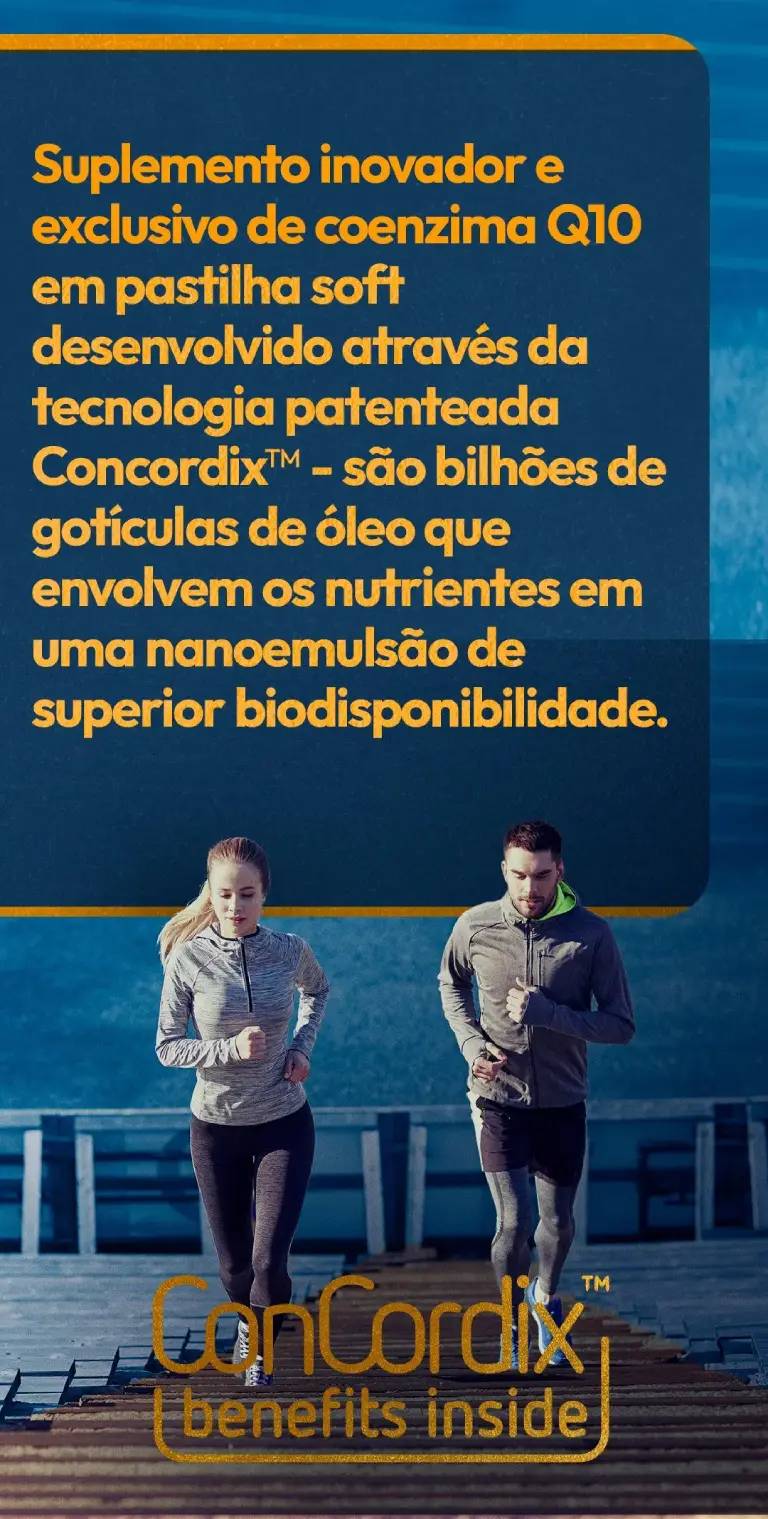 Suplemento inovador e exclusivo de coenzima Q10 em pastilha soft desenvolvido através da tecnologia patenteada Concordix™ - são bilhões de gotículas de óleo que envolvem os nutrientes em uma nanoemulsão de superior biodisponibilidade.