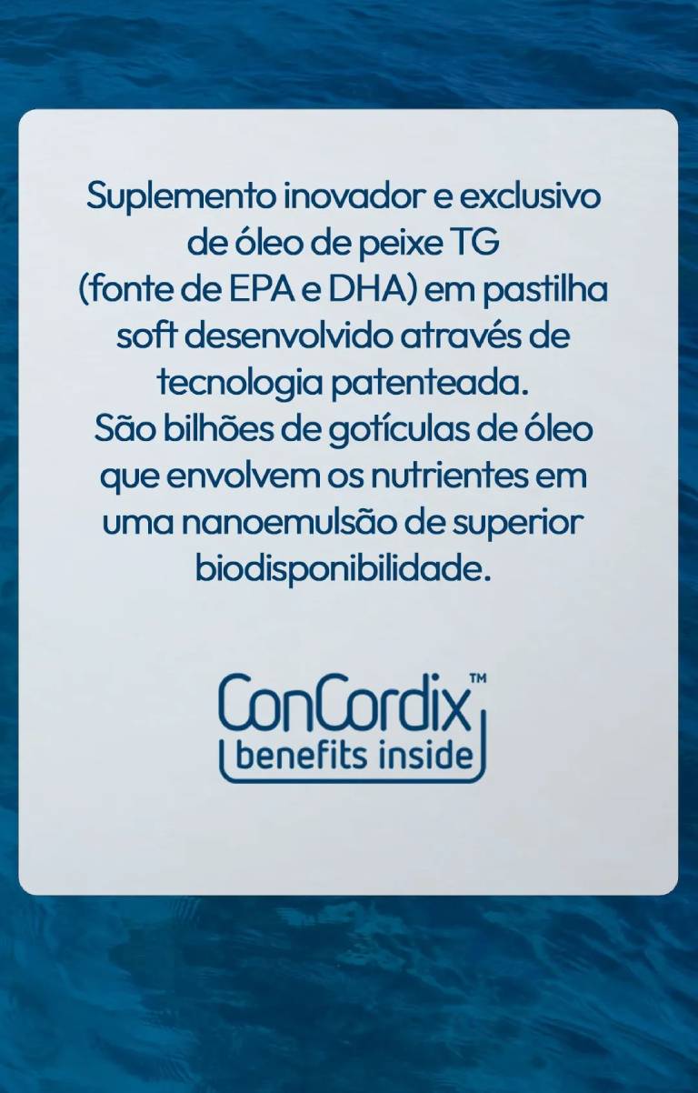 Suplemento inovador e exclusivo de óleo de peixe TG (fonte de ácidos graxos ômega 3 EPA e DHA) em pastilha soft desenvolvido através da tecnologia patenteada Concordix™ - são bilhões de gotículas de óleo que envolvem os nutrientes em uma nanoemulsão de superior biodisponibilidade.